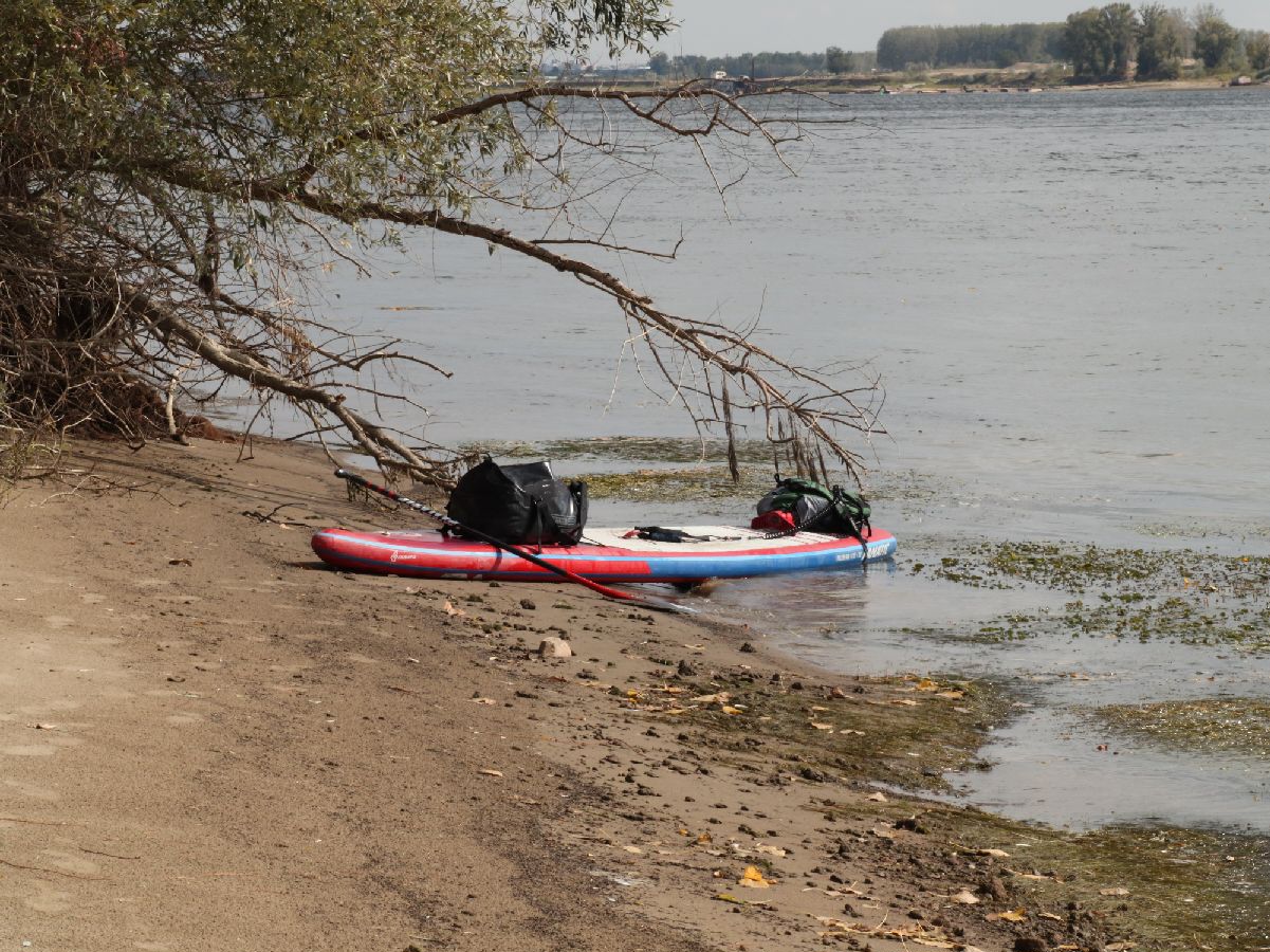 The Danube again displayed an impressive width today, with the route often punctuated by small islands and sandbanks in the Danube. For Pascal this was a fairly lonely stage; on the Bulgarian side he passed precisely three small villages on the way to Lom. On the Romanian side there was not a trace of any settlement to be seen. And that will be the case until, at river kilometre 630, there's once more a village directly on the Romanian side of the Danube. He only caught sight of a few barges and passenger ships. Pascal doesn't let it worry him. For to be in nature, to enjoy the peace and quite, to let his thoughts roam free; there were exactly the things, alongside the main aim of protecting water landscapes, driving his intention to paddle to the Black Sea. Pascal can still find accommodation on the Bulgarian side and, if necessary, he can be flexible in this regard due to his tent. Today Pascal used the many idyllic islands and sandbanks for a total of three short breaks.