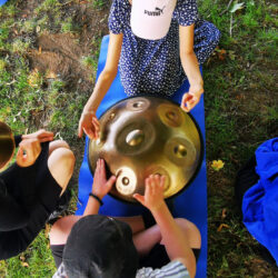 An der Achtsamkeitsstation entstanden stille Zeichen: Ein Federwassertropfen als Symbol für unser Engagement für das Wasser und all seine Lebewesen. Eine andere Gruppe fügte sich spielerisch in das „blaue Band“ ein, als Zeichen dafür, dass wir in all unserer kulturellen Vielfalt dennoch aus einer Einheit bestehen. Wiederum andere ließen sich an der Handpan auf ihr eigenes Rhythmusgefühl ein. Auch hier zeigte sich wieder: Das Wasser, so instabil seine Oberfläche auch wirkt, stiftet Halt – wenn wir einander sehen.