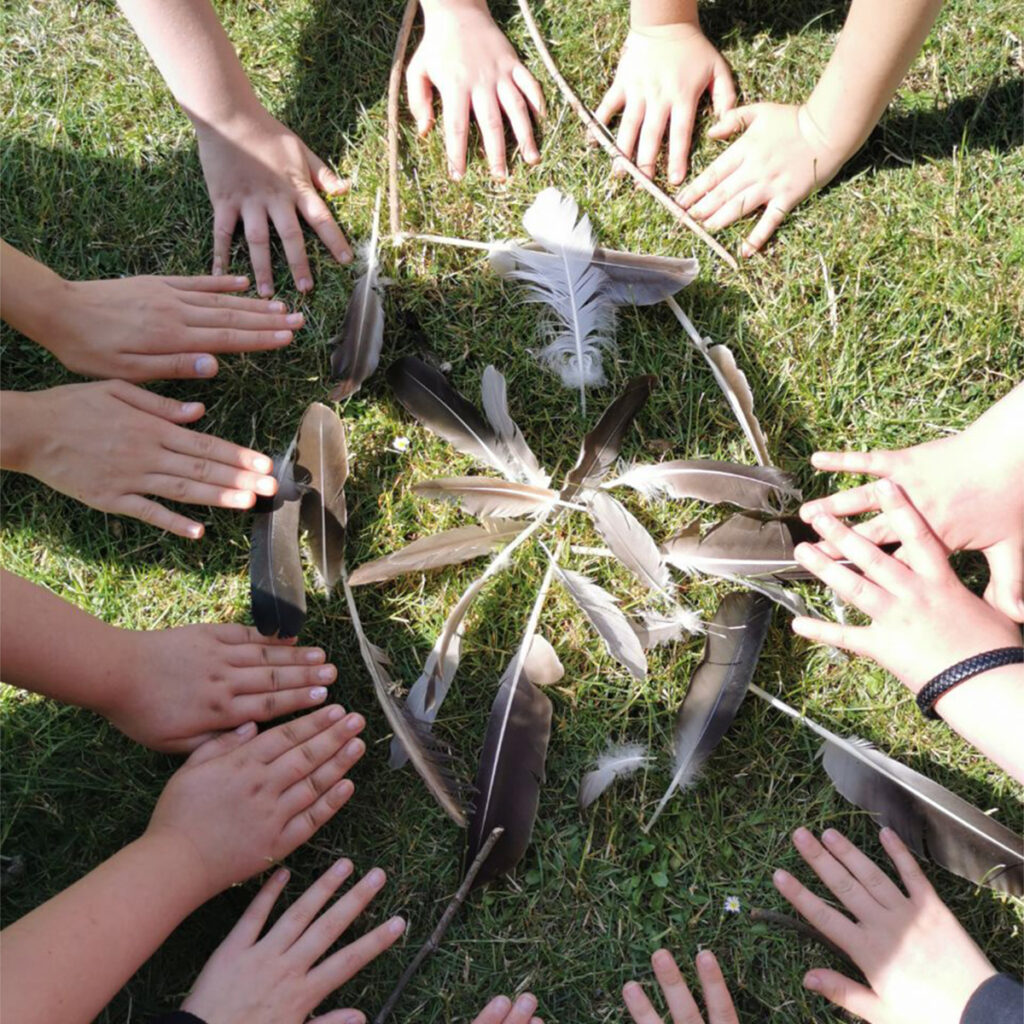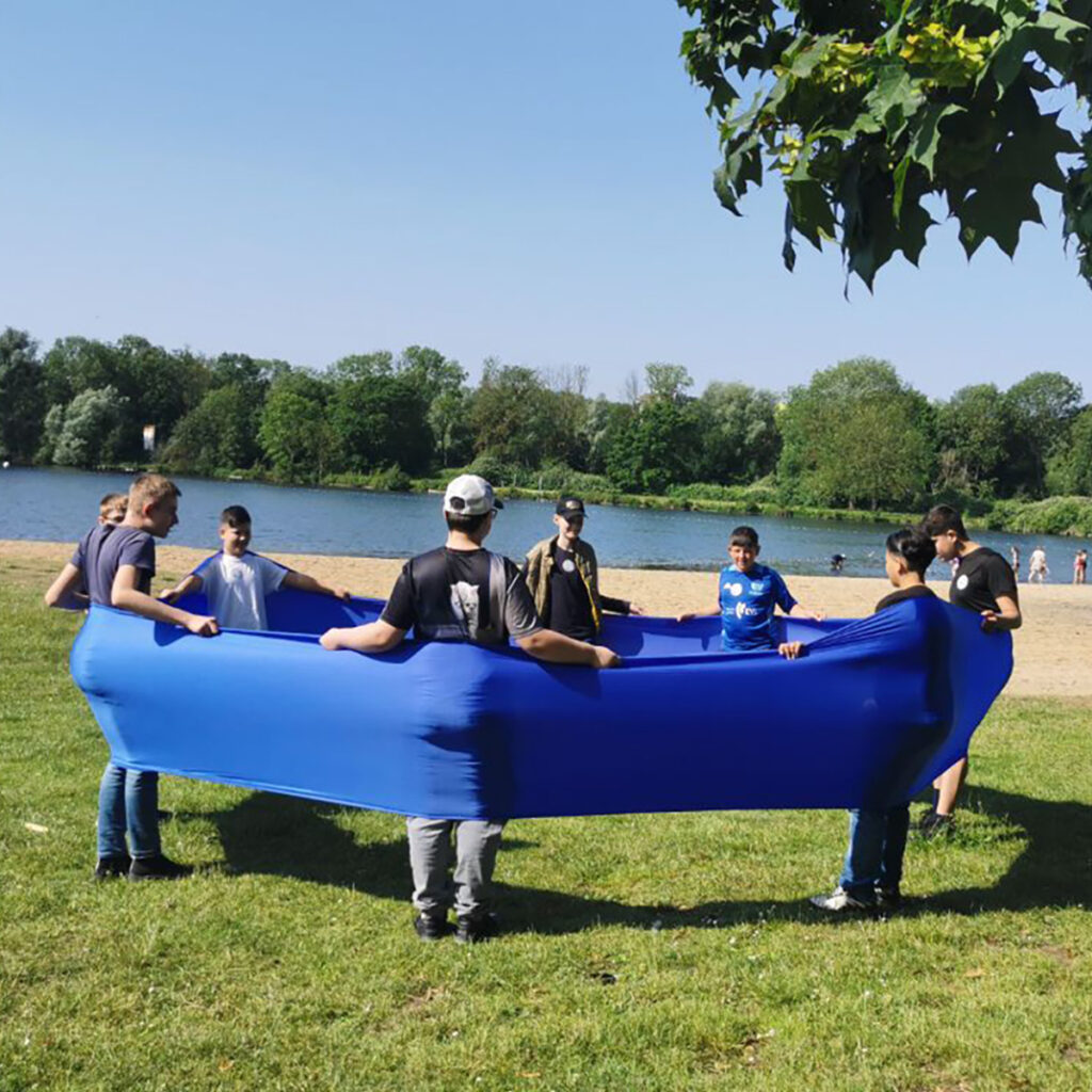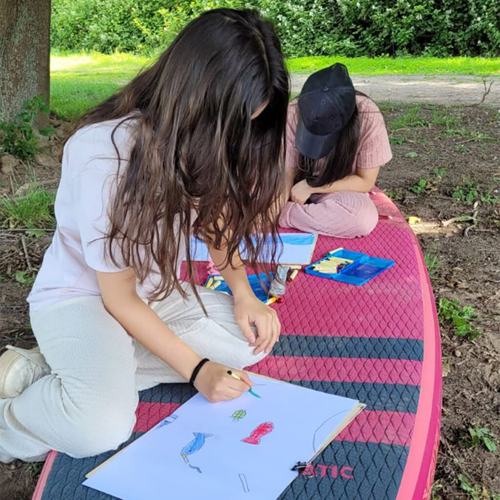 An der Achtsamkeitsstation entstanden stille Zeichen: Ein Federwassertropfen als Symbol für unser Engagement für das Wasser und all seine Lebewesen. Eine andere Gruppe fügte sich spielerisch in das „blaue Band“ ein, als Zeichen dafür, dass wir in all unserer kulturellen Vielfalt dennoch aus einer Einheit bestehen. Wiederum andere ließen sich an der Handpan auf ihr eigenes Rhythmusgefühl ein. Auch hier zeigte sich wieder: Das Wasser, so instabil seine Oberfläche auch wirkt, stiftet Halt – wenn wir einander sehen.