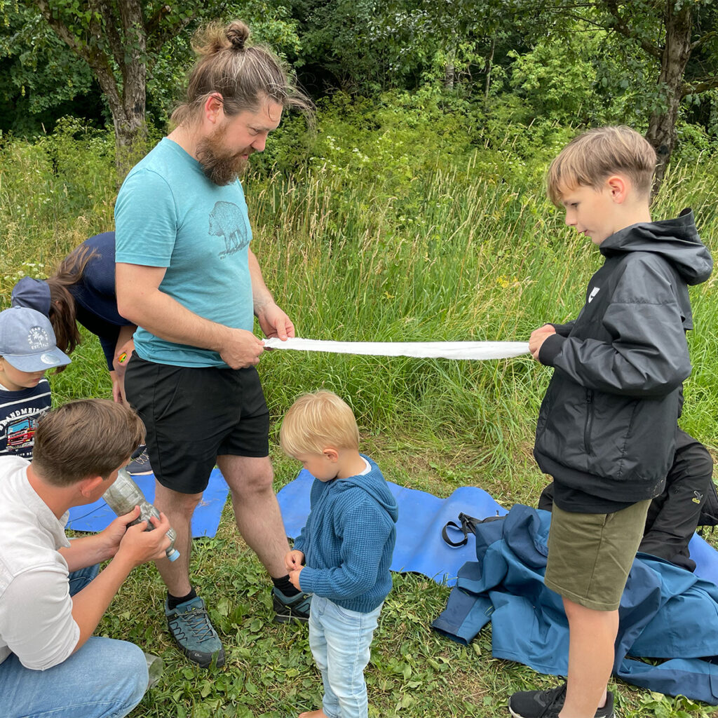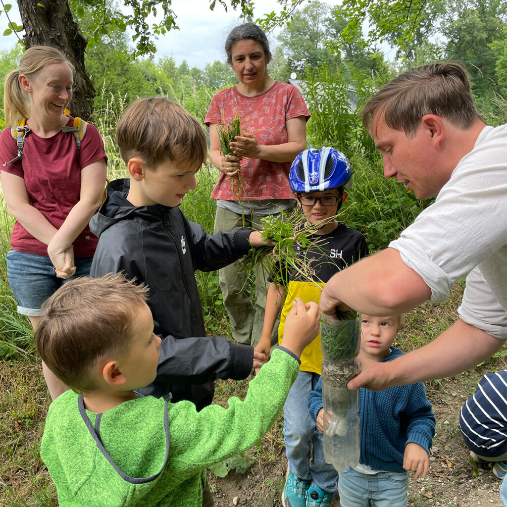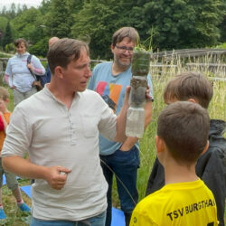 Entlang mehrerer spannender Stationen wurde gelauscht, gefragt, gestaunt. Am Wasserhaus und am Hochbehälter nahm Thomas Dotzer vom Wasserwerk die Teilnehmenden mit auf eine Reise durch das lokale Wassersystem, vom tiefen Grundwasser bis zum klaren Strahl aus dem Wasserhahn. Auch die Rückreise wurde betrachtet und wie das benutzte Wasser über die Kläranlage seinen Weg zurück in die Flüsse findet.