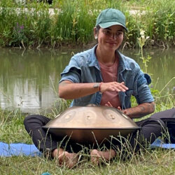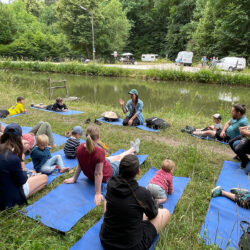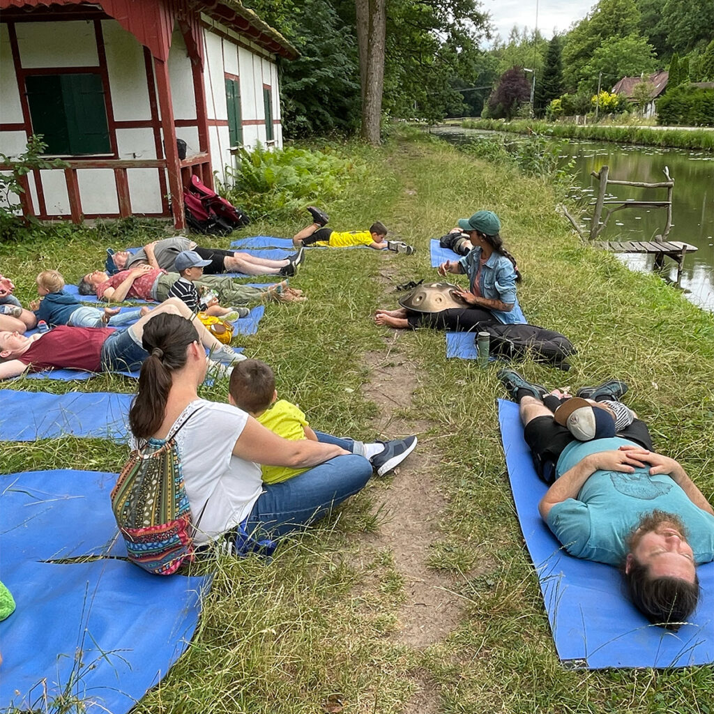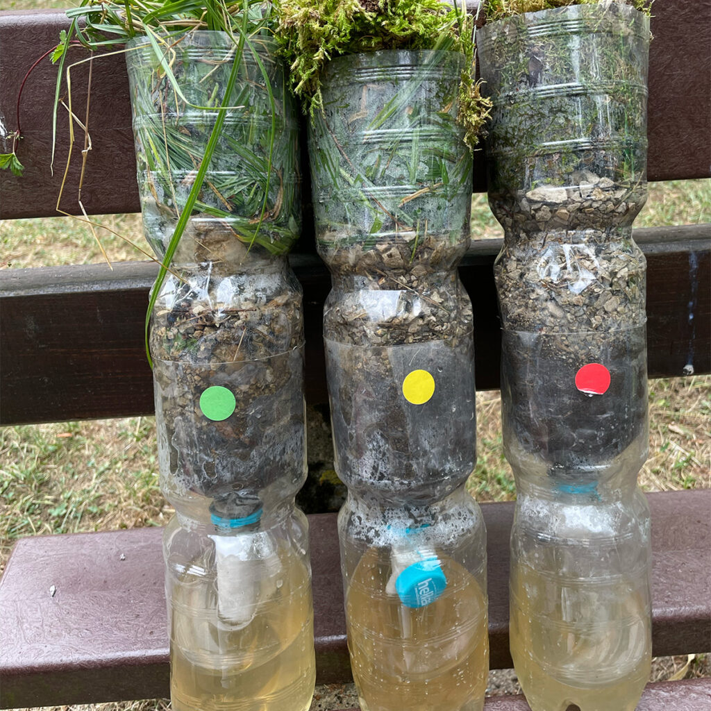 Nach einer kleinen Stärkung an der Schleuse 35 ging es weiter zur Schleuse 33 am Ludwig-Main-Donau-Kanal. Dort warteten unsere vier Wasserstationen und mit ihnen Momente der Ruhe, Kreativität und Erkenntnis. Sanfte Klänge der Handpan luden zum Innehalten ein. An der Kreativstation entstanden unter leichtem Sommerregen schöne Wasserbilder. Und wer wollte, konnte mit Pascal, Maria und Hannes erfahren, wie ein selbstgebauter Wasserfilter die Reinigungsleistung unserer Erdschichten sichtbar macht.