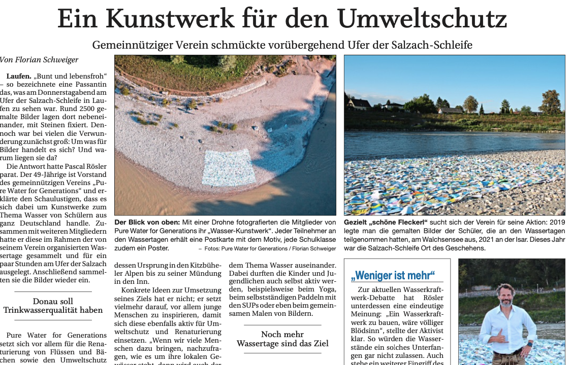 Florian Schweiger vom Reichenhaller Tagblatt berichtet in Ein Kunstwerk für den Umweltschutz ausführlich über unser Wasser-Kunstwerk am Ufer der Salzach-Schleife in Laufen und unseren diesjährigen Wassertagen für den Umweltschutz. MAHALO für den sagenhaften Artikel!