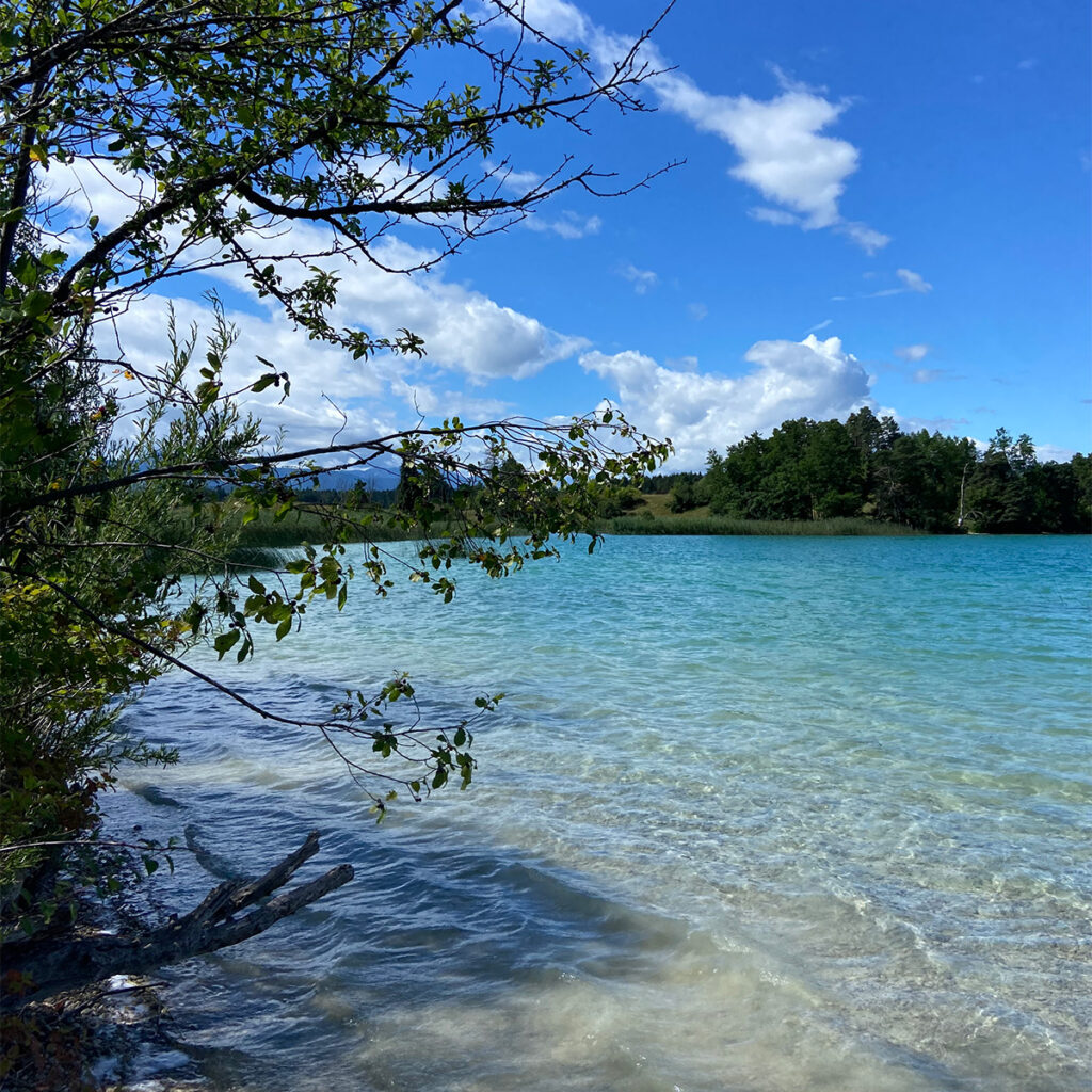 Der Fohnsee lag nach dem Gewitter der Nacht fast paradiesisch da. Das Wasser strahlte uns klar und türkis entgegen. Der Fohnsee gehört zu den Osterseen, einer Gruppe aus 20 Seen südlich des Starnberger Sees. Seit 1981 stehen die Osterseen unter Naturschutzgebiet. Ein Gebiet, das atmen darf.